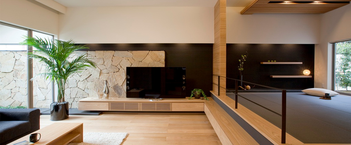 カフェのようなリラックス空間、天井の間接照明と床素材とグリーンのソファーが部屋の雰囲気をやさしく演出します。